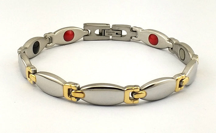 “93A: Ionized 4 In 1” Has Alternating Links of Polished Stainless Steel with 18K Gold Connecting Links Bordering With Four Elements! We are always asked. Can I get it wet? YES, you can shower or go in the pool with this bracelet on.