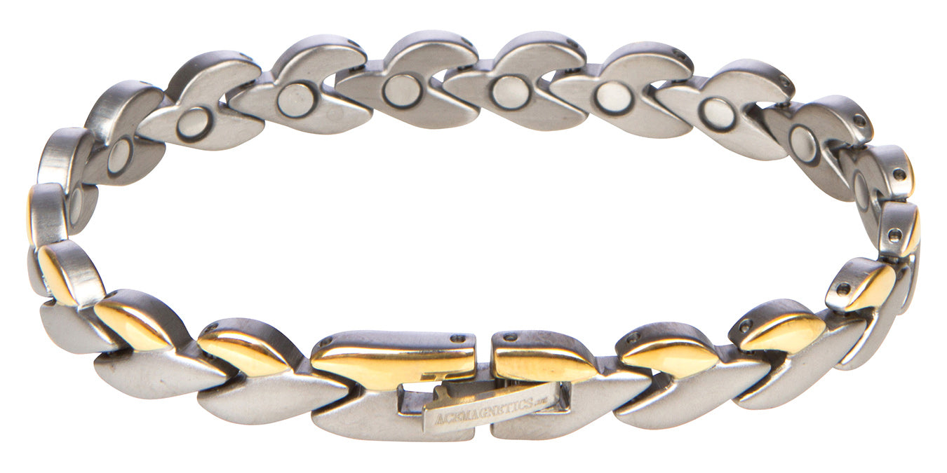 We have crafted The "Blossom" style out of Hypo Allergenic Titanium for a very light weight feel and durable piece of jewelry. Additionally we have embedded 3500 gauss laser point north facing neodymium magnets in each and every link. Don't let the name disarm you , "Blossom" is a powerful companion to take you through your day everyday.