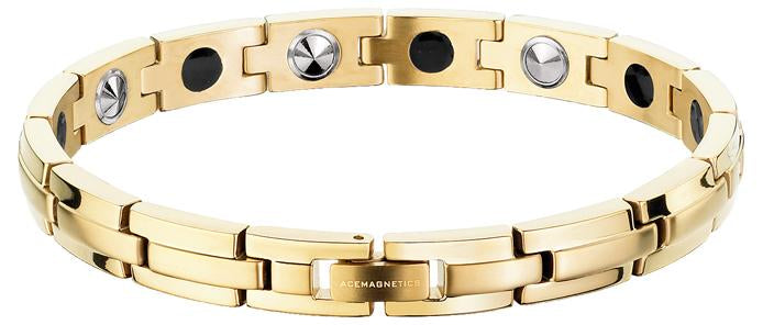 “El Dorado”@ 1/4' wide is a stunning 18K gold plated ultra light weight titanium bracelet with five cubic zirconia crystals along the exterior with both permanent 3800 Gauss Rare Earth neodymium magnets & Two 99.99% pure Japanese germanium stones embedded which make this a Negative Ion Producing Machine & the perfect Gift. (Size 8.25 Has 3 Germanium Stones FYI)