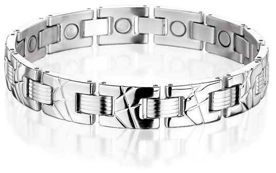 @ 1/2 inch wide with brushed stainless pin striped connector links and polished stainless links for a unique new look. We included 3800 gauss neodymium north facing laser point magnets in every link that will not wear out over time because that is what you want. Enjoy the good looks of this mosaic pattern and independent feel this magnetic bracelet from AceMagnetics.com will bring to you!