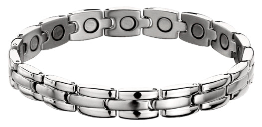 3/8" wide - A classic, understated style! This stainless steel bracelet is a quality piece of jewelry that looks great and with fourteen (size small) fifteen (size medium) sixteen(size large), permanent laser point/neodymium/north facing/unipole magnets@3800 gauss each you have a 53,200 or 57,000 gauss or 60,800 gauss magnetic bracelet for only $49.95! These powerful neodymium magnets are hidden within our contemporary, fashionable link bracelets polished outside and polished middle band of durable stainless steel. Since many customers call and say "we can't find these around here anymore" we suggest you consider buying two for yourself - one for now - and one for a rainy day down the road. We package our bracelets in a simple, unisex jewelry box ready to be gift wrapped. Now at unbeatable factory-direct pricing from @AceMagnetics.com
