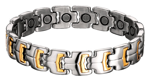 6B is 1/2" wide; what can we say, just look at the workmanship with magnets in every link @3800 gauss each. There are 16 to 18 magnets in every bracelet, i.e. M = 16 or 60,800 gauss, L = 17 or 64,600 gauss, XL = 18 or 68,400 total gauss per XL bracelet – WOW! We use 18K gold which is best for durability and longevity (24K is too soft and will chip off too easily) and brushed stainless steel for an understated, classy and strong sporty look. Permanent laser point, neodymium, north facing, unipole magnets that will not lose their strength all for only $49.95! Since many customers call and say "we can't find these around here anymore" we suggest you consider buying two for yourself - one for now - and one for that rainy day down the road.