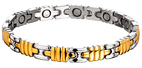 4B Stainless Steel Magnetic Bracelet is only 1/4' wide but commands the attention of both men and women; everyone likes this style! The contemporary design of alternating 18k polished gold and mirrored stainless steel links coupled with powerful magnets hidden beneath the sleek exterior makes this a very easy one to choose.