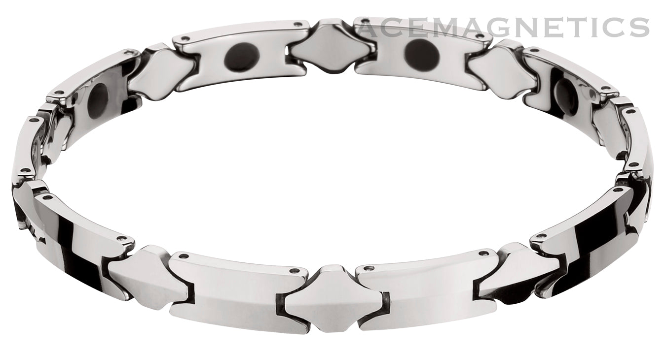 We are pleased to introduce "Contours" a Space Age Tungsten Carbide magnetic bracelet measuring 3/8' wide that will retain its highly polished & highly reflective mirror finish forever. Contours is virtually impossible to scratch & is embedded with 4500 Gauss Rare Earth Permanent Magnets in every link!